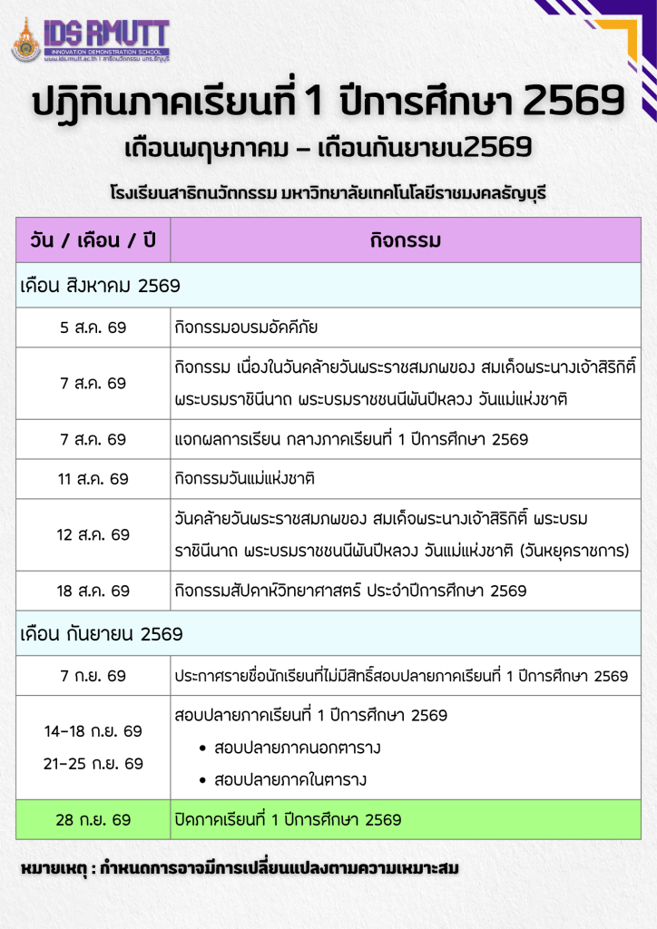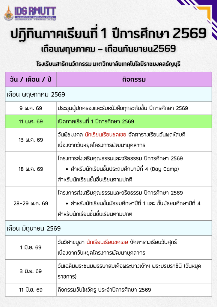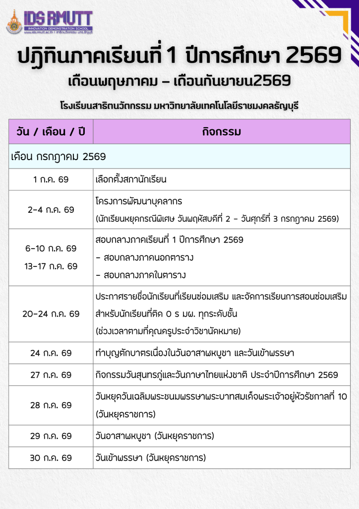 ปิดฉากอย่างประทับใจ โครงการ IDS Summer Camp 2026 มุ่งเน้นการเรียนรู้วัฒนธรรมควบคู่นวัตกรรมดิจิทัล เสริมสร้างทักษะระดับสากลให้แก่เยาวชน10/04/2026 ปฏิทินภาคเรียนที่ 1 ปีการศึกษา 2569 เดือนพฤษภาคม – เดือนกันยายน2569 Share วิศว สวนกูล Related posts15/02/2026ภาพบรรยากาศ การคัดเลือกนักเรียน ระดับชั้นมัธยมศึกษาปีที่ 1 มัธยมศึกษาปีที่ 4 และระหว่างชั้น ระดับประถมศึกษาปีที่ 4 (รอบทั่วไป) ประจำปีการศึกษา 2569Read more