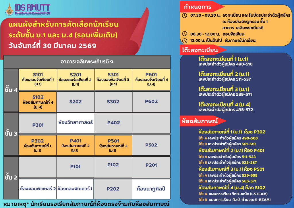 ประชาสัมพันธ์ถึงนักเรียนและผู้ปกครองทุกท่าน เพื่อเตรียมความพร้อมสำหรับการทดสอบข้อเขียนและการสอบสัมภาษณ์ ในรอบคัดเลือกเพิ่มเติม ขอให้ผู้สมัครศึกษารายละเอียดจุดรายงานตัวและกำหนดการดังนี้: