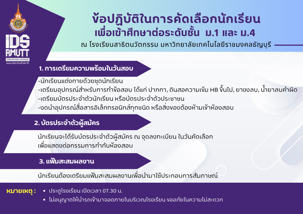 โรงเรียนสาธิตนวัตกรรม มทร.ธัญบุรี ขอประกาศรายชื่อนักเรียนที่มีสิทธิ์เข้ารับการคัดเลือกเพื่อเข้าศึกษาต่อในระดับชั้นมัธยมศึกษาปีที่ 1 และมัธยมศึกษาปีที่ 4 ประจำปีการศึกษา 2569 (รอบเพิ่มเติม) โดยผู้สมัครสามารถตรวจสอบรายชื่อได้ตามลิงก์ด้านล่างนี้: