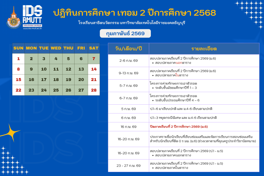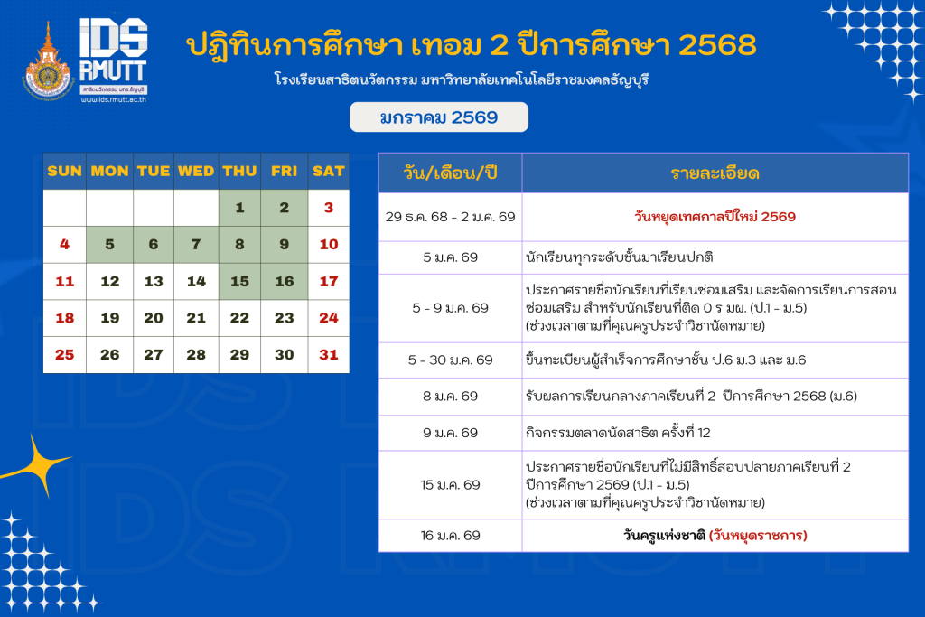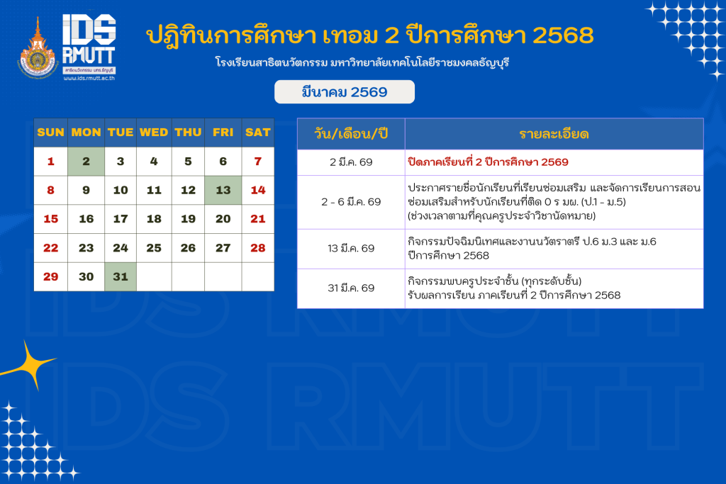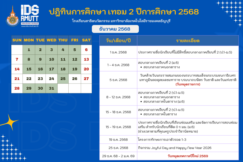 ประกาศรับสมัครบุคคลเพื่อคัดเลือกและจ้างเป็นลูกจ้างชั่วคราว (จ้างเหมา) 3 ตำแหน่ง08/10/2025 ปฎิทินการศึกษา เทอม 2 ปีการศึกษา 2568 Share วิศว สวนกูล Related posts10/03/2025ปฏิทินการศึกษา ภาคเรียนที่ 1 ปีการศึกษา 2568Read more