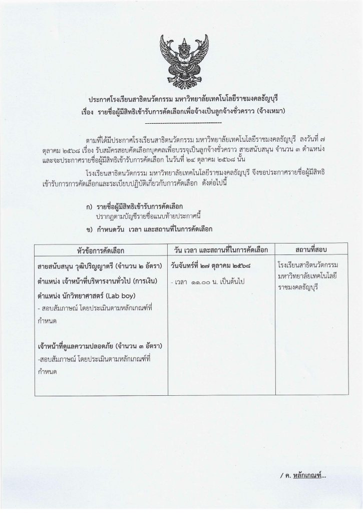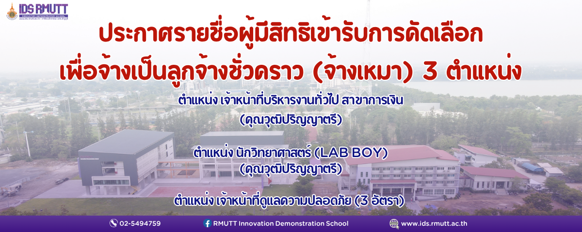 ประกาศรายชื่อผู้มีสิทธิเข้ารับการคัดเลือกเพื่อจ้างเป็นพนักงานพิเศษเงินรายได้ ตำแหน่ง ครูผู้ช่วย 3 ตำแหน่ง22/10/2025 ประกาศรายชื่อผู้มีสิทธิเข้ารับการคัดเลือกเพื่อจ้างเป็นลูกจ้างชั่วคราว สายสนับสนุน จำนวน 3 ตำแหน่ง ประกาศรายชื่อ ประกาศรายชื่อจ้างเหมาดาวน์โหลด Share วิศว สวนกูล Related posts22/10/2025ประกาศรายชื่อผู้มีสิทธิเข้ารับการคัดเลือกเพื่อจ้างเป็นพนักงานพิเศษเงินรายได้ ตำแหน่ง ครูผู้ช่วย 3 ตำแหน่งRead more