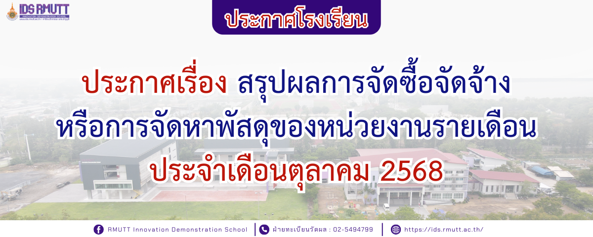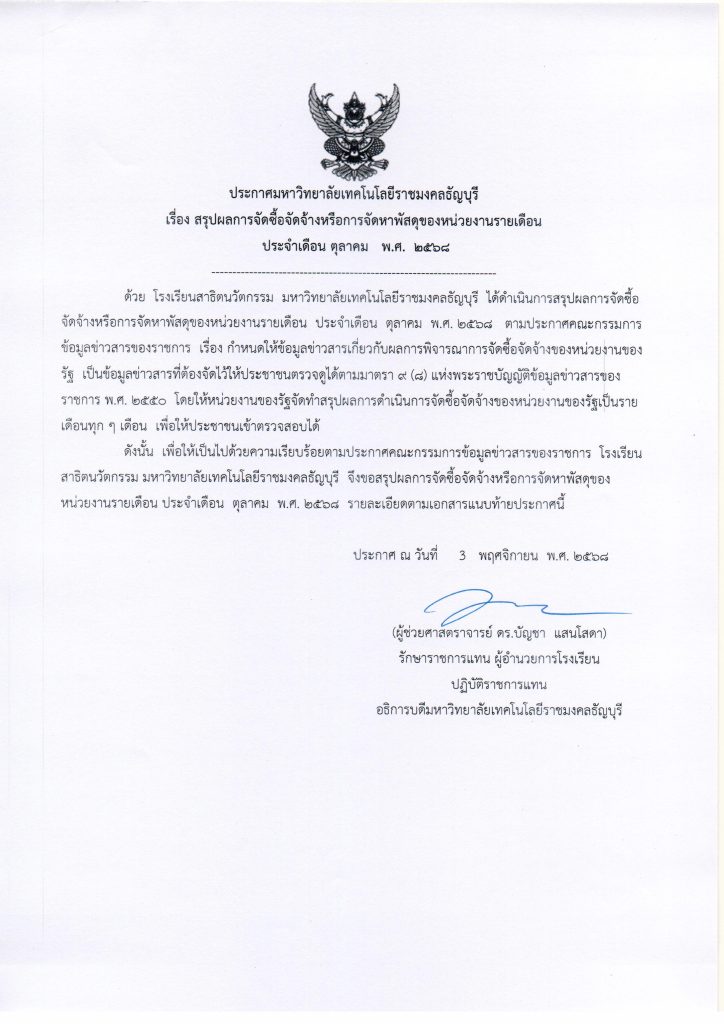 05/11/2025ประกาศเรื่อง สรุปผลการจัดซื้อจัดจ้าง หรือการจัดหาพัสดุของหน่วยงานรายเดือน ประจำเดือนตุลาคม 2568