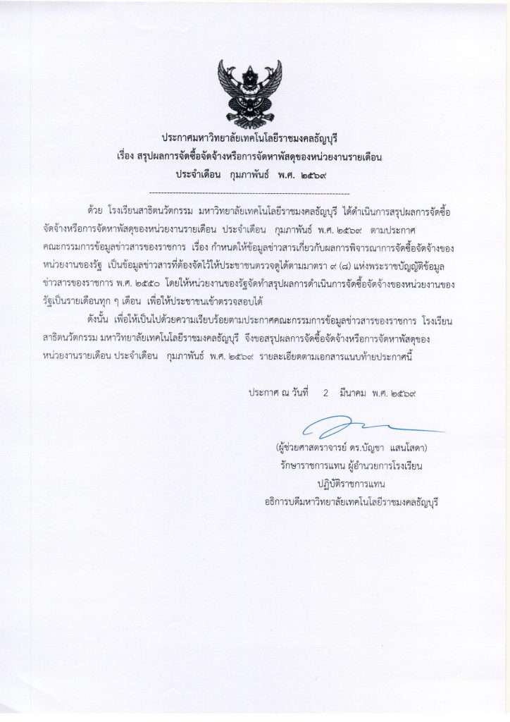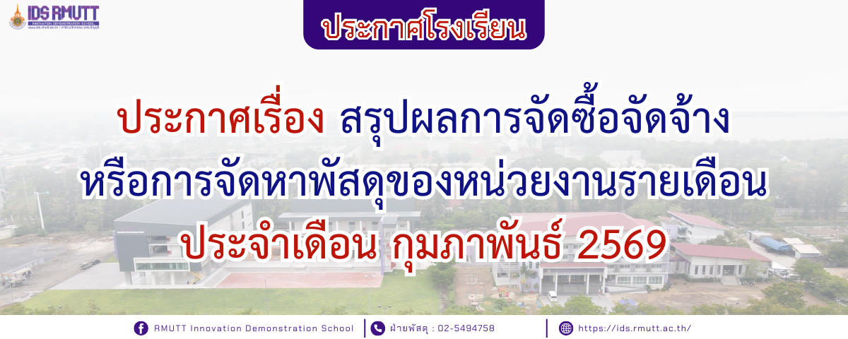 05/03/2026ประกาศเรื่อง สรุปผลการจัดซื้อจัดจ้าง หรือการจัดหาพัสดุของหน่วยงานรายเดือน ประจำเดือน กุมภาพันธ์ 2569